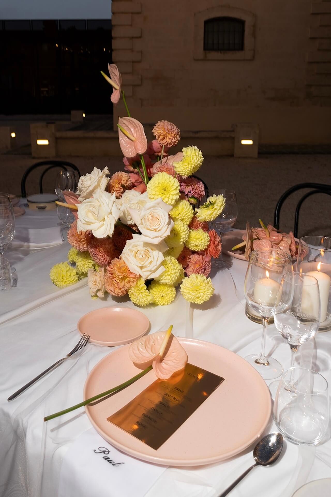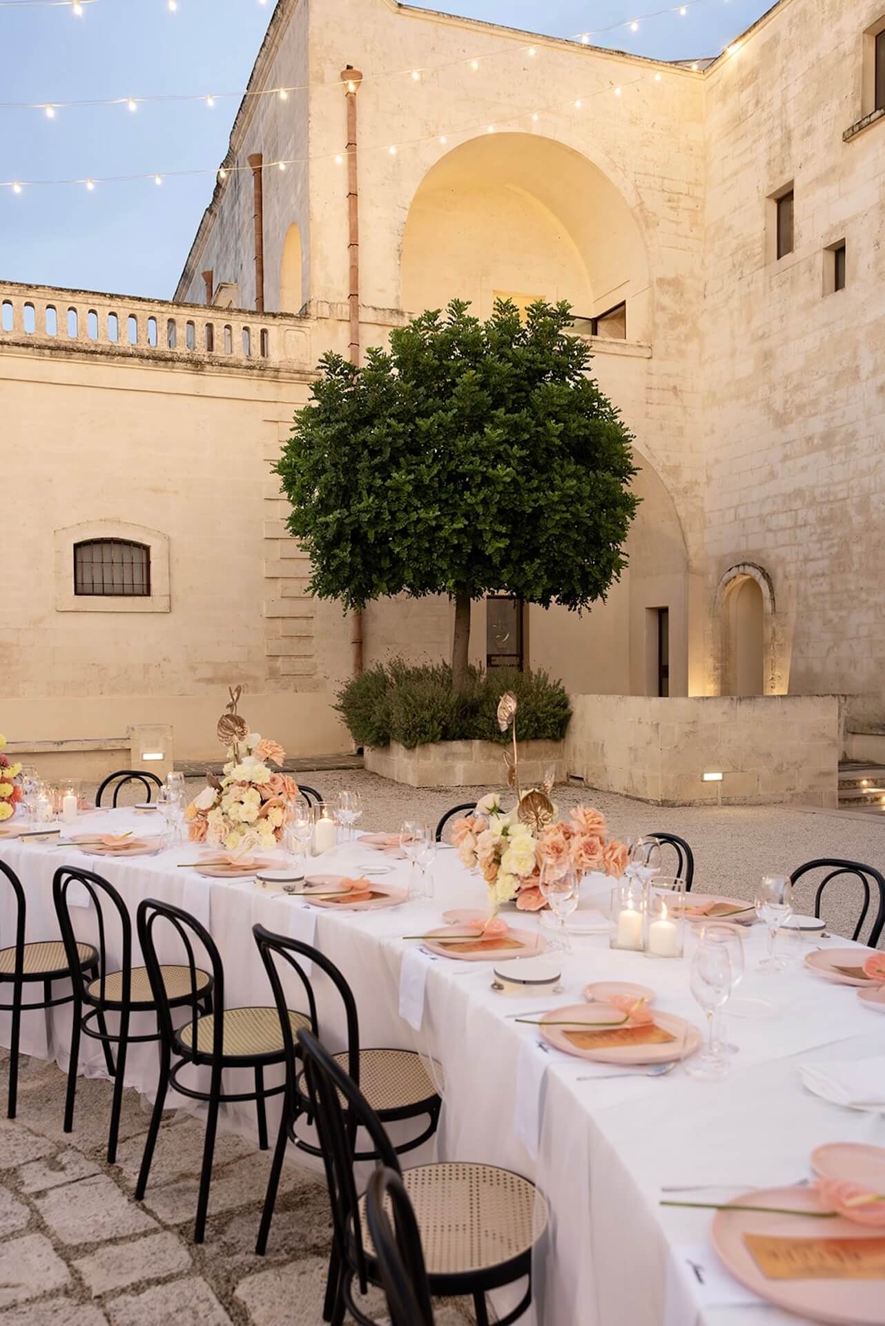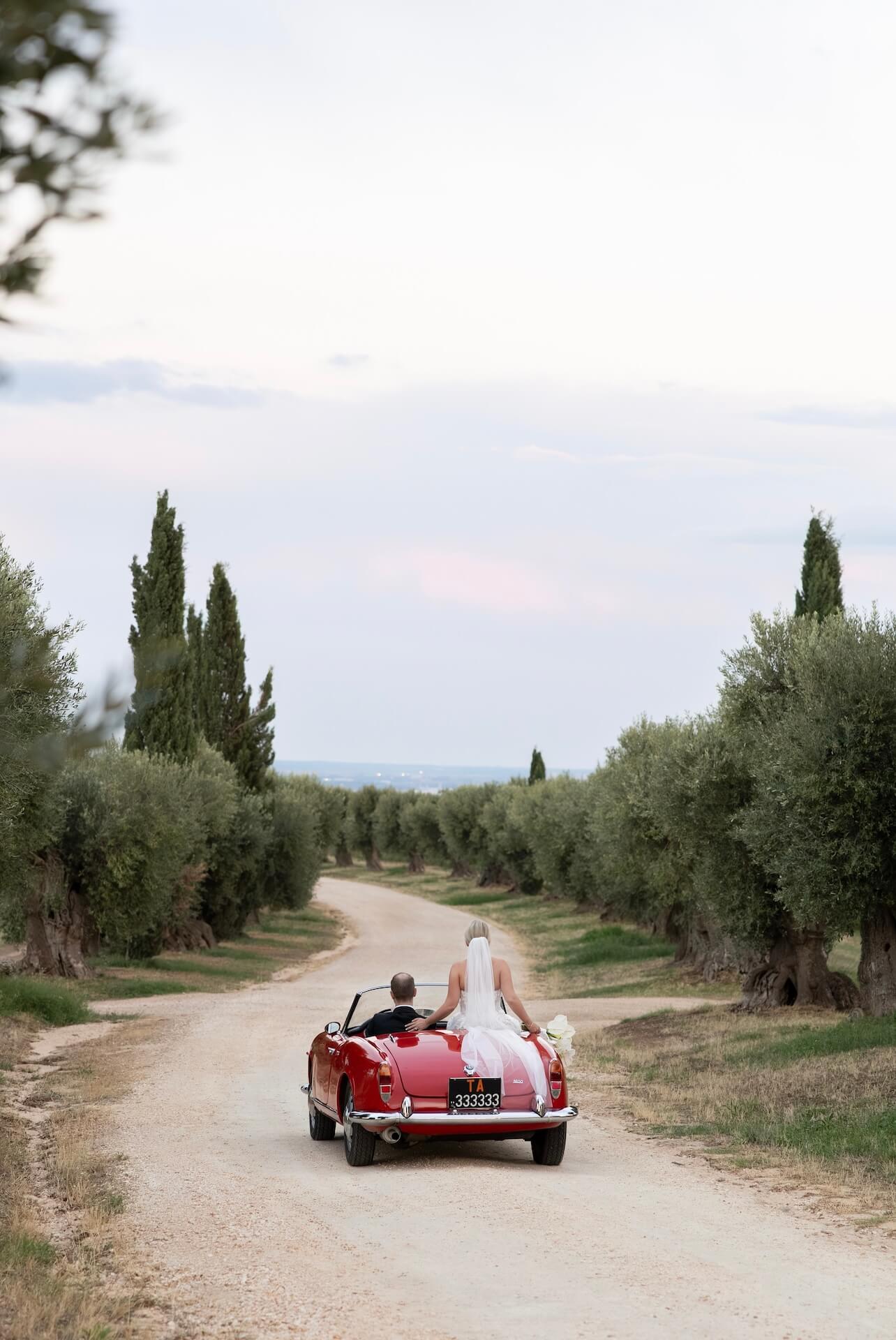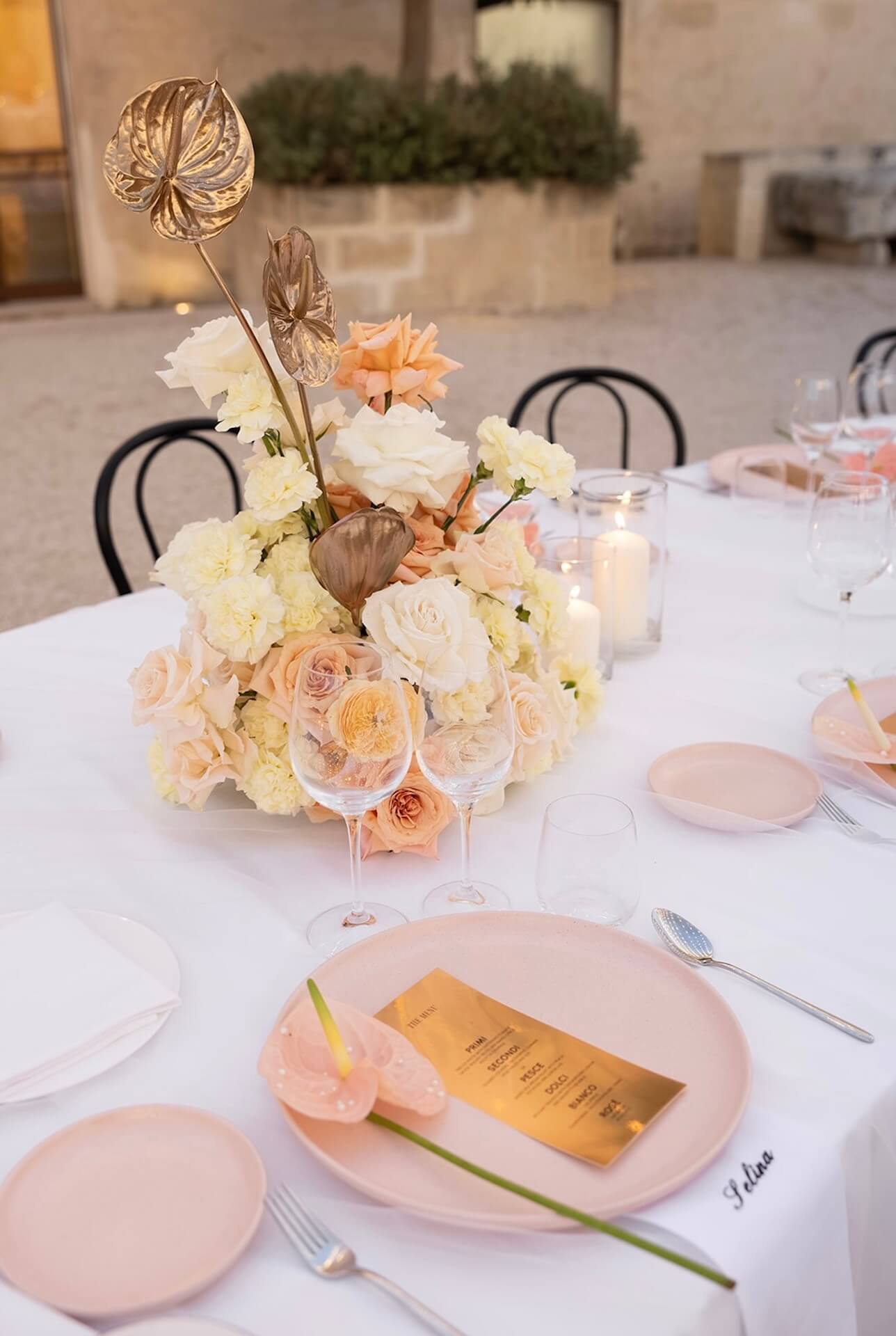 Drawing inspiration from the masseria’s bronzed architectural details, the concept “Apulian Bronze Hour” blended contemporary elegance with the region’s natural Mediterranean beauty with soft rosé mirror menu cards, warm metallic accents, and sculptural bronzed floral details. Under a canopy of fairy lights, guests enjoyed a round dinner table design that gently echoed the circular layout of the courtyard, intentionally embracing and enhancing the venue’s organic architectural features. A classic red Alfa Romeo added a timeless touch of Italian romance to this unforgettable Puglia wedding celebration.