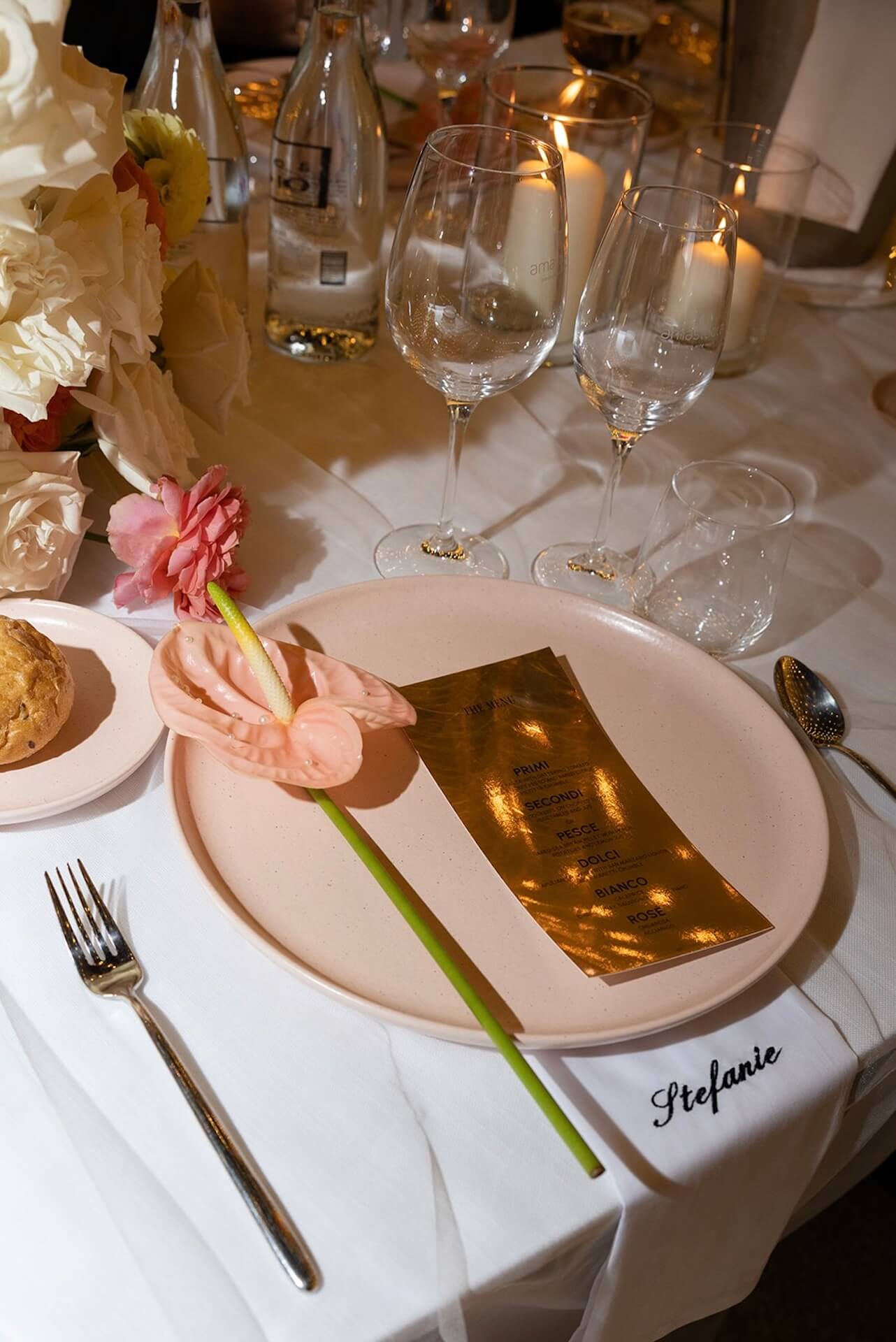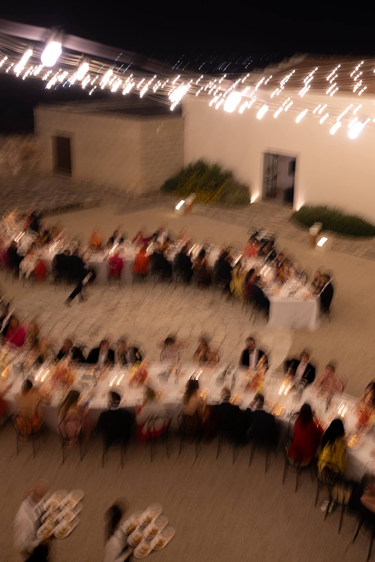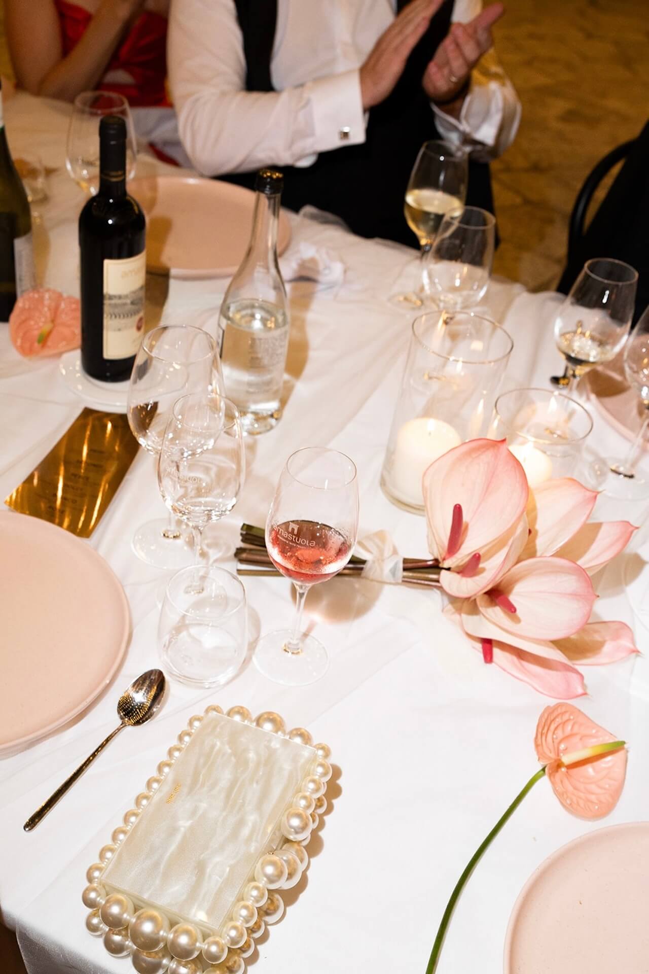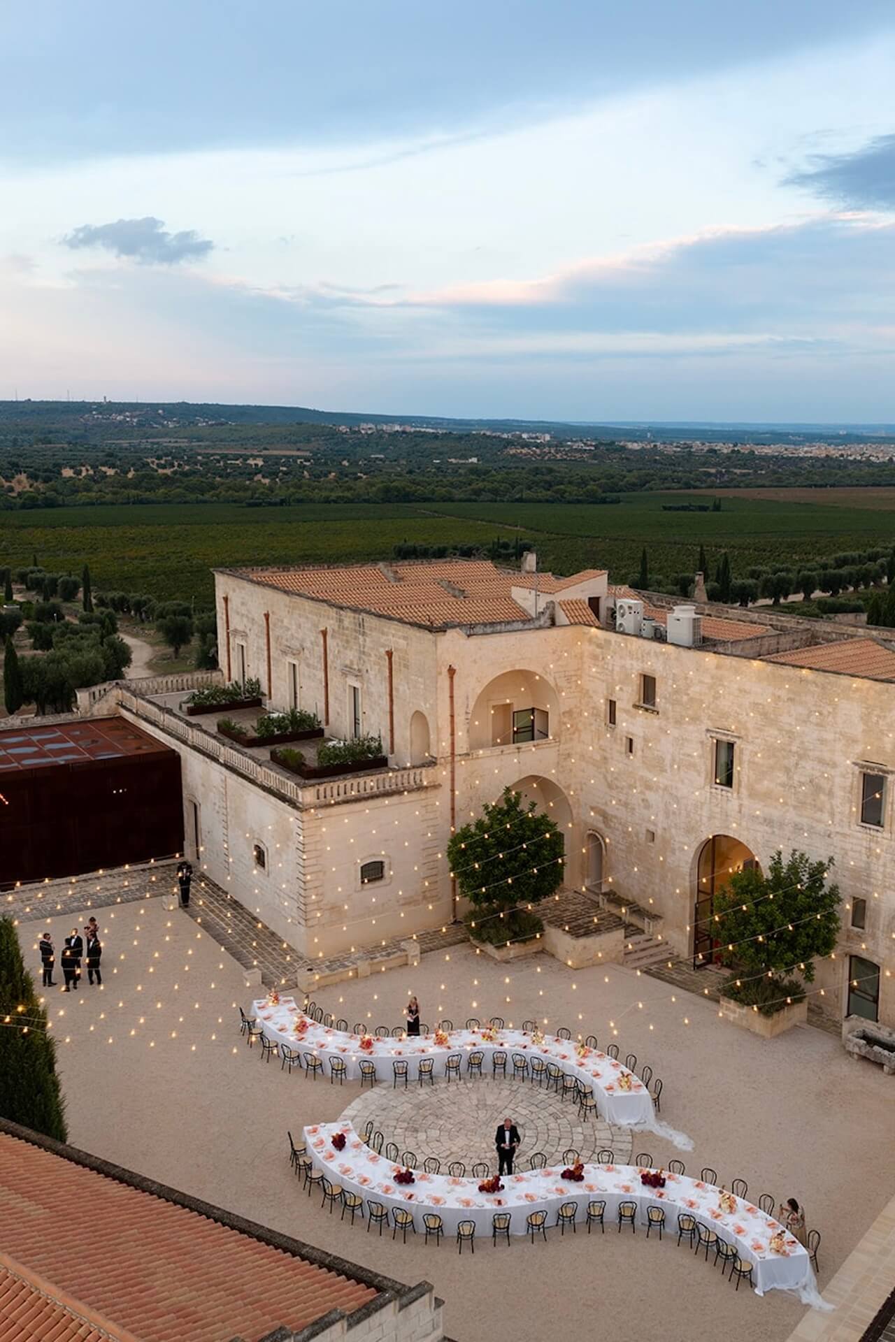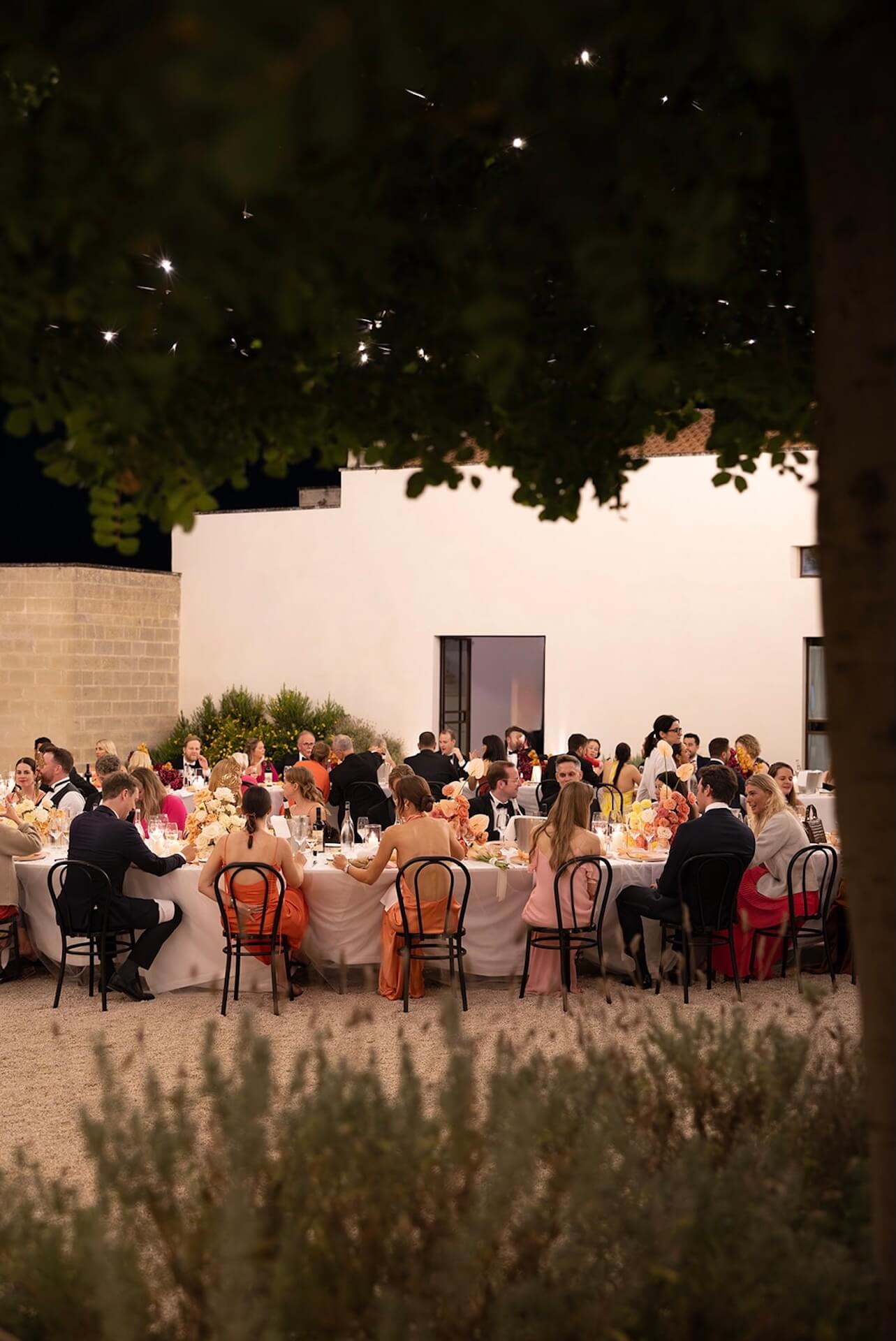Drawing inspiration from the masseria’s bronzed architectural details, the concept “Apulian Bronze Hour” blended contemporary elegance with the region’s natural Mediterranean beauty with soft rosé mirror menu cards, warm metallic accents, and sculptural bronzed floral details. Under a canopy of fairy lights, guests enjoyed a round dinner table design that gently echoed the circular layout of the courtyard, intentionally embracing and enhancing the venue’s organic architectural features. A classic red Alfa Romeo added a timeless touch of Italian romance to this unforgettable Puglia wedding celebration.