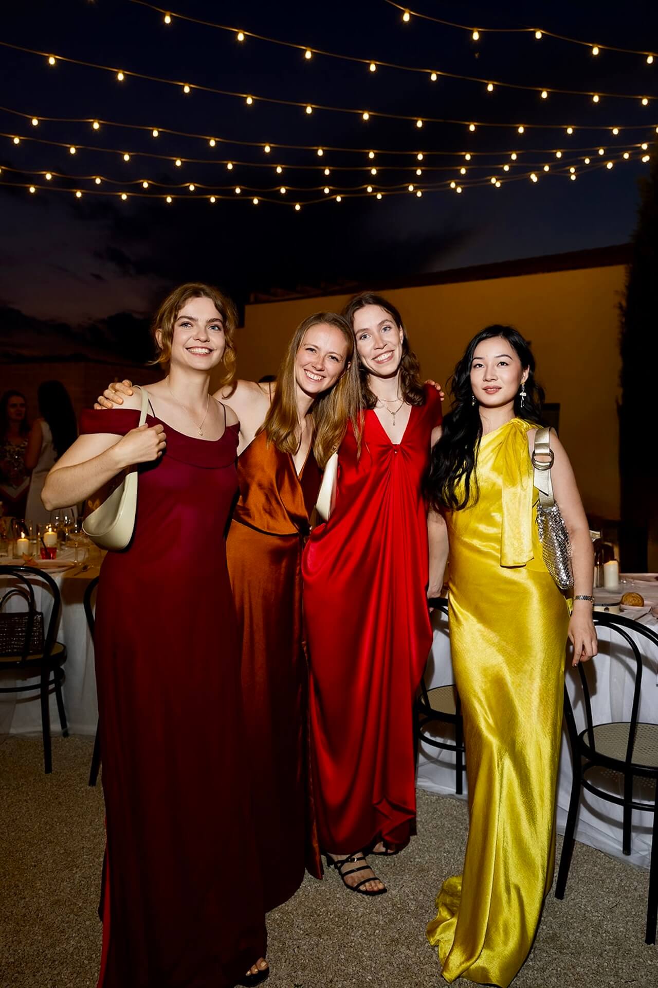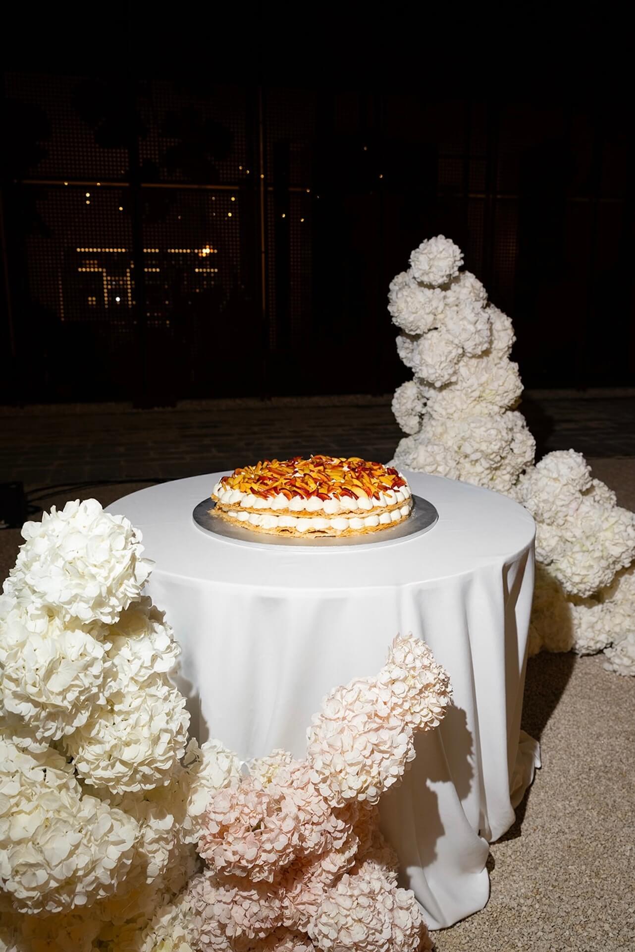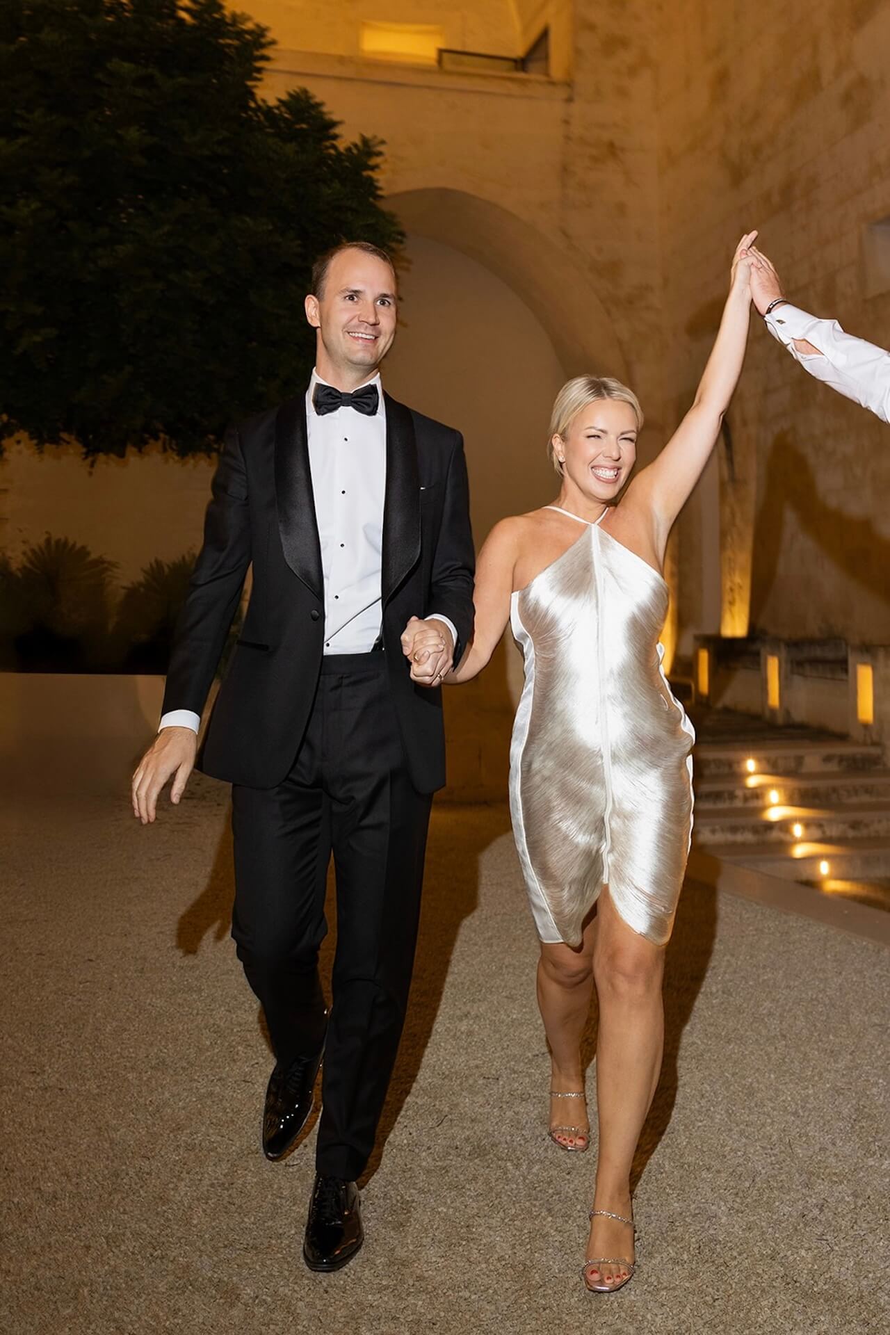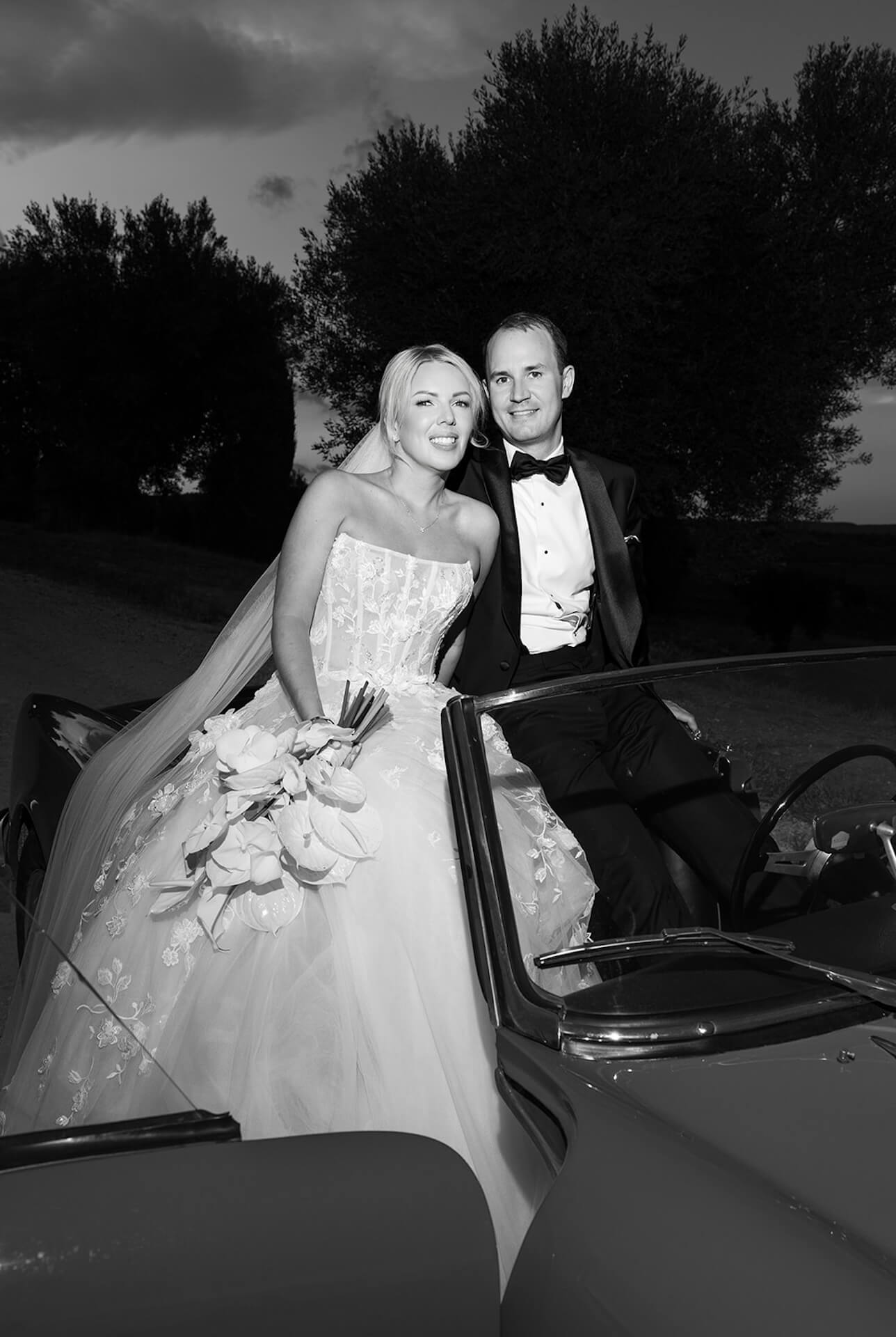 Drawing inspiration from the masseria’s bronzed architectural details, the concept “Apulian Bronze Hour” blended contemporary elegance with the region’s natural Mediterranean beauty with soft rosé mirror menu cards, warm metallic accents, and sculptural bronzed floral details. Under a canopy of fairy lights, guests enjoyed a round dinner table design that gently echoed the circular layout of the courtyard, intentionally embracing and enhancing the venue’s organic architectural features. A classic red Alfa Romeo added a timeless touch of Italian romance to this unforgettable Puglia wedding celebration.